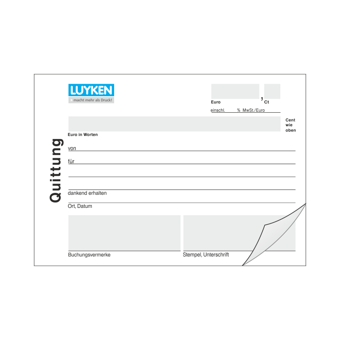 Unsere Quittungsblöcke erhalten Sie geblockt zu 25 Satz, wahlweise nummeriert und gelocht. Auch ein Rückseitendruck in grau, z. B. für Ihre allgemeinen Geschäftsbedingungen, ist möglich.